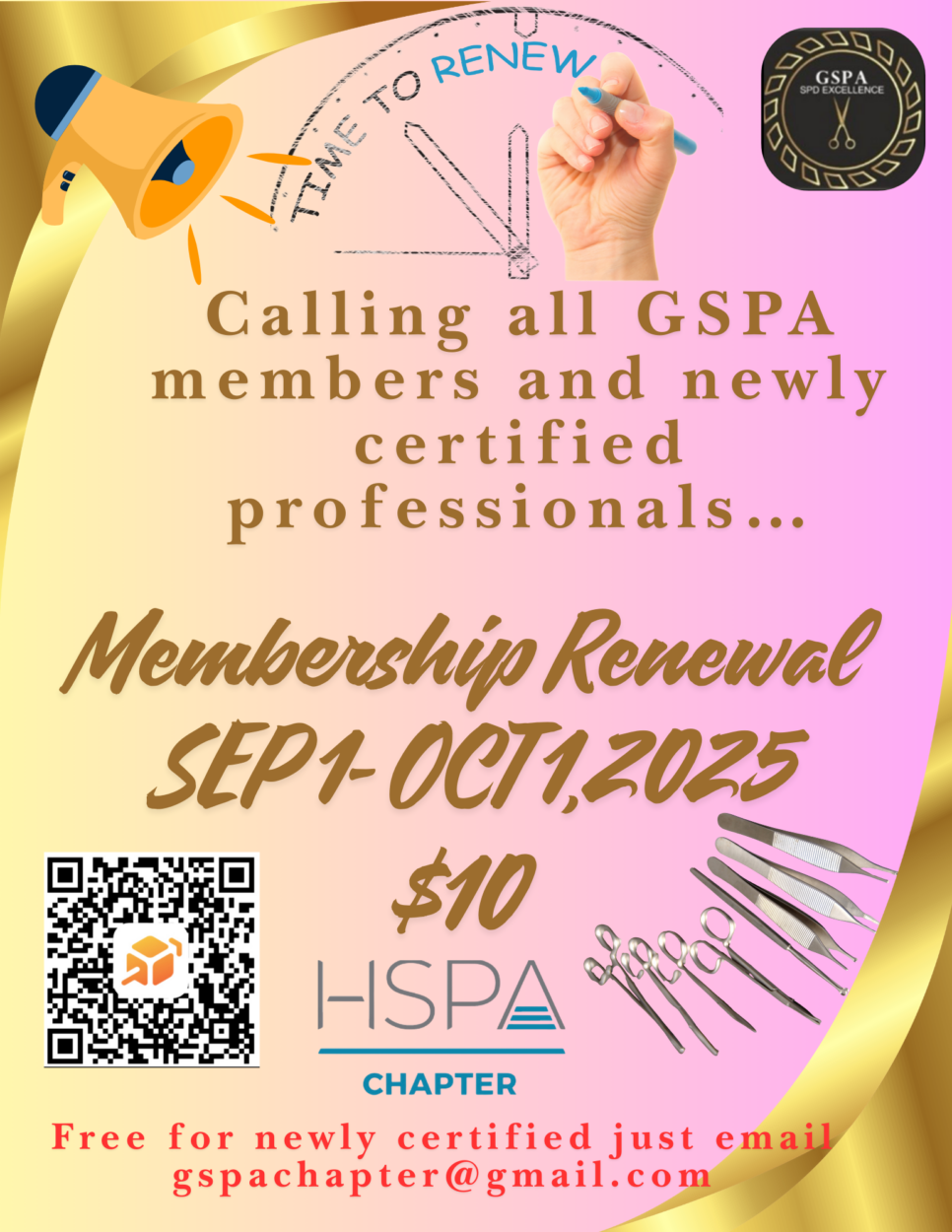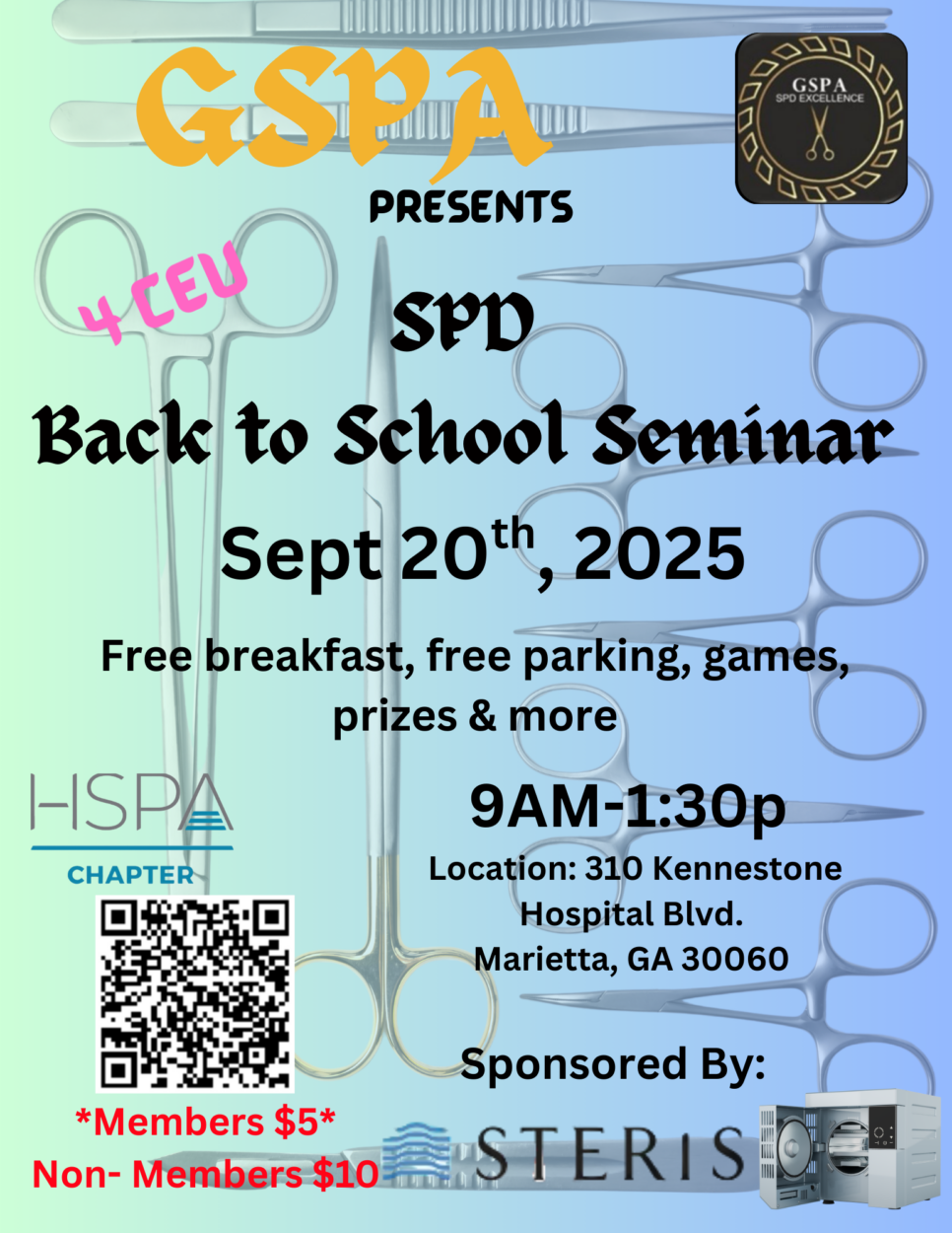 The Georgia Sterile Processing Association or GSPA was rebooted in July 2024 to serve the Atlanta metro area of SPD professionals and health individuals alike. The chapter will serve as a resource for jobs, career advancement, educational seminars, networking, and community outreach for our members and community.
